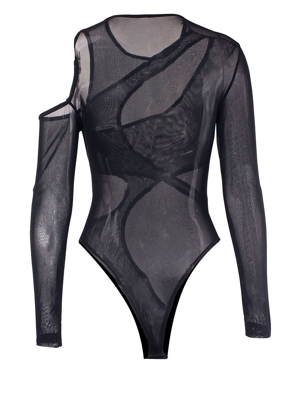 Body entero ajustado de mujer con transparencias de malla y diseño asimétrico a