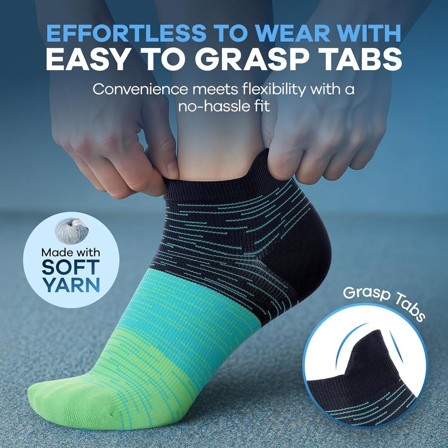 Compresión específica y soporte de arco: Los calcetines de compresión de tobillo proporcionan un apoyo enfocado con compresión suave y graduada en el arco y zonas de compresión clave: ideales para pies planos, artritis, fascitis plantar y dolor de tobillo. Ayudan a aumentar la circulación, reducir la hinchazón y aliviar los calambres y la fatiga muscular. Nunca son ampollas y están diseñados para comodidad durante todo el día, ya sea que estés de pie durante largas horas en el trabajo, recuperándote de un entrenamiento o mantenerte activo durante todo el día.