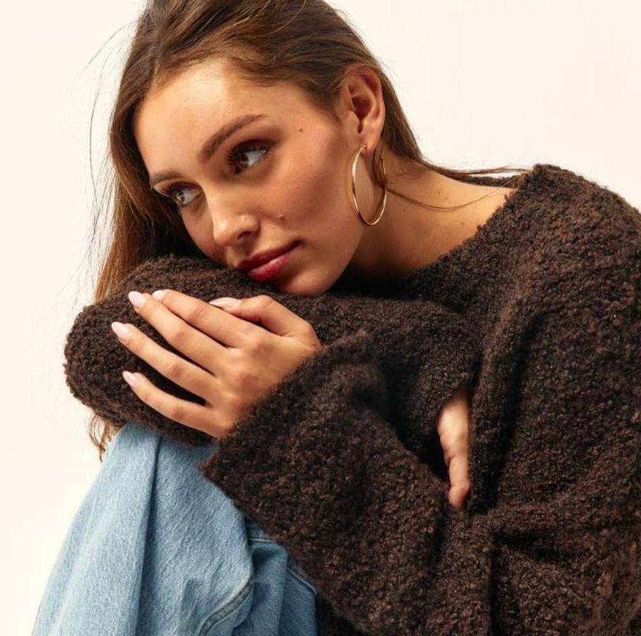 Almere Suéter boucle para mujer, cuello redondo de gran tamaño, mezcla de lana