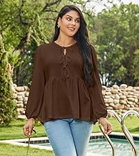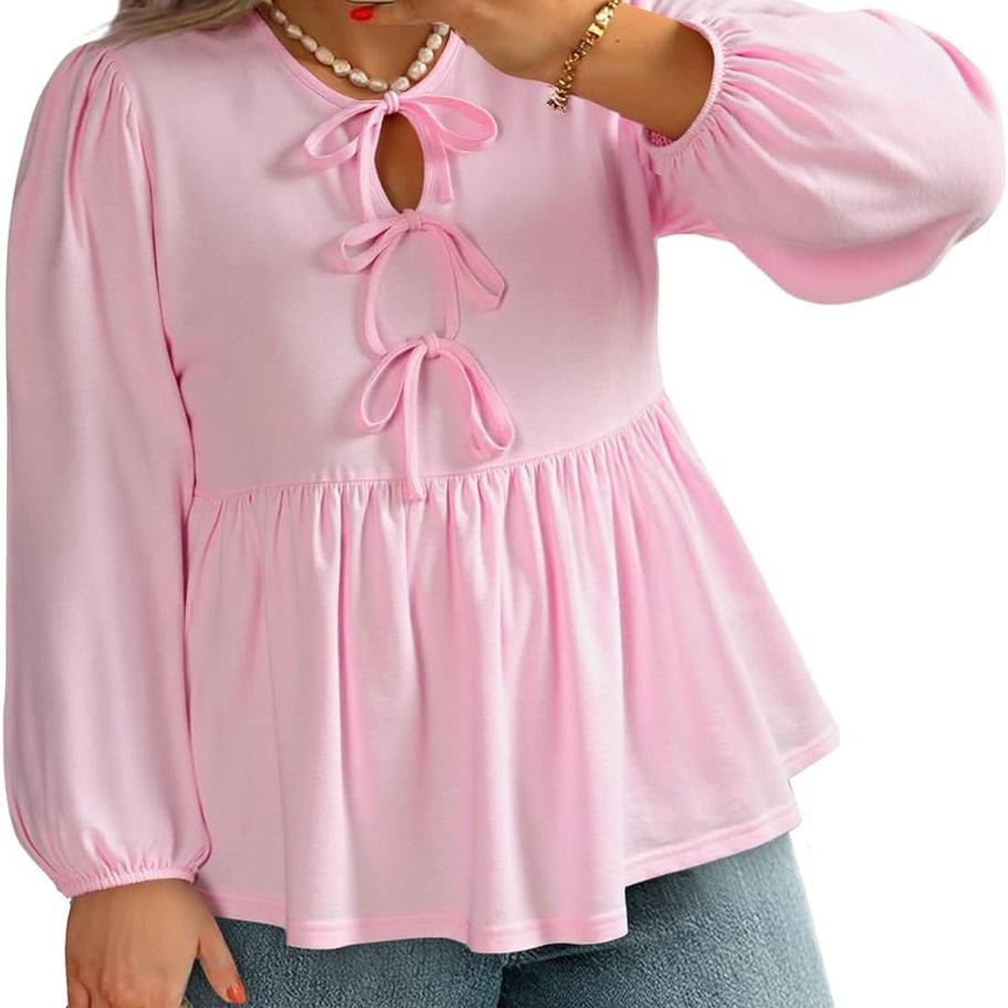 Detalles de diseño: esta ropa de talla grande para mujer cuenta con cierres en el cuello para que coincida con los lazos decorativos para atar a sí mismos, manga larga abombada y un dobladillo peplum acampanado