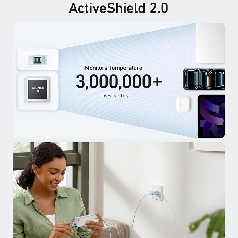 Protección mejorada con ActiveShield 2.0: la tecnología patentada de Anker protege sus dispositivos al monitorear inteligentemente la temperatura más de 3 millones de veces al día, lo que es el doble de frecuencia que ActiveShield 1.0.