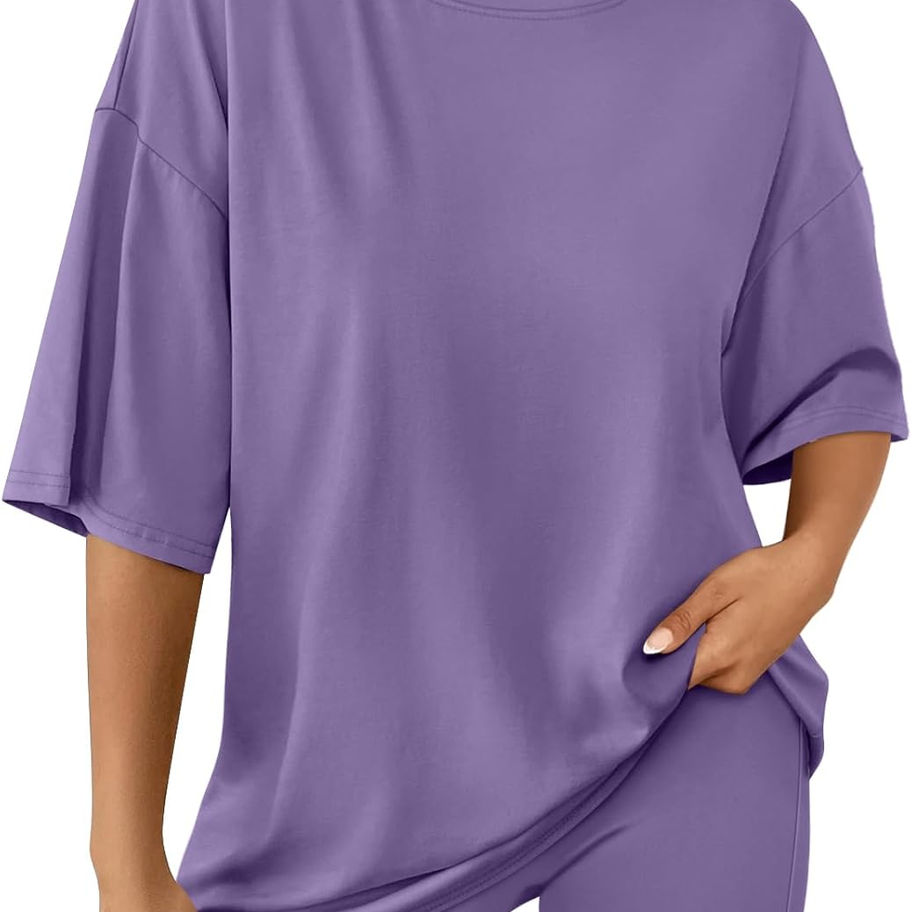★Característica: los conjuntos de 2 piezas a juego para mujer cuentan con cuello redondo, color sólido, de gran tamaño, camisetas de manga corta con pantalones cortos de ciclista de cintura alta para un ajuste más cómodo y favorecedor para mostrar tu bonita figura