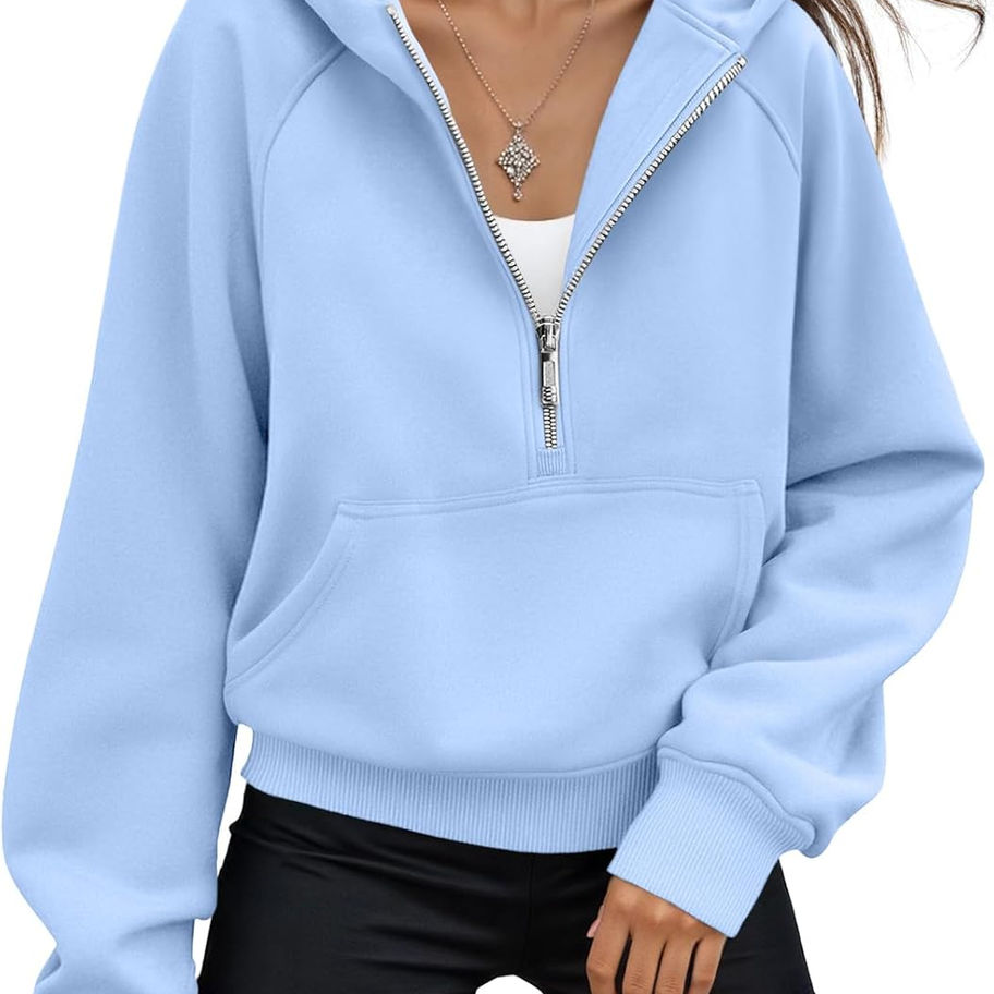 Diseño: sudadera con capucha de media cremallera para entrenamiento atlético, sudadera para mujer, cuello de hombro caído, manga larga, cuello con capucha con media cremallera, color sólido, longitud recortada, forro polar, ajuste relajado, tops cortos, trajes de otoño e invierno para mujeres y adolescentes, estilo moderno y casual.