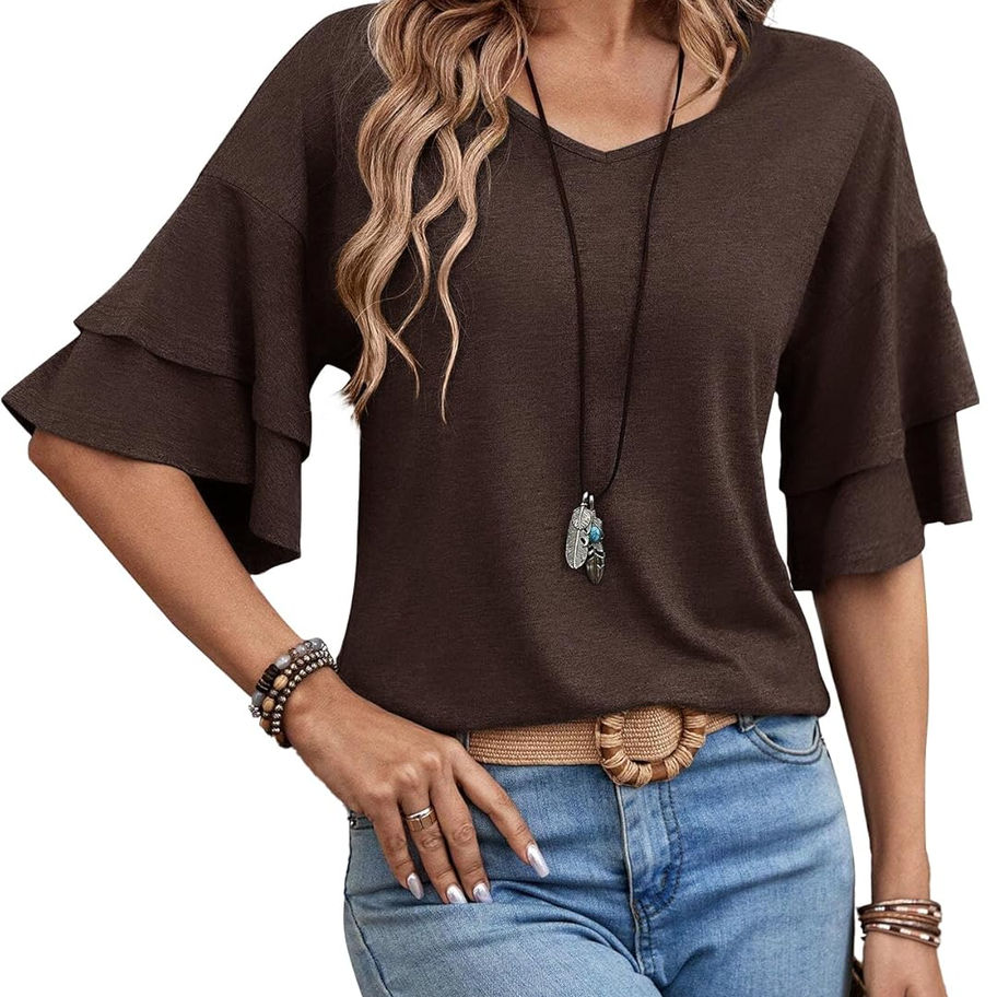 Combinación y ocasión: las camisetas y blusas para mujer son perfectas para combinar con tus jeans, faldas, pantalones cortos o leggings favoritos. Esta túnica de manga con volantes para mujer es perfecta para cualquier ocasión, incluyendo trabajo, negocios, oficina, vacaciones, viajes, salidas, citas, fiestas y clubes. Esta elegante camiseta casual es un artículo de moda indispensable en el armario de las mujeres 2025.
