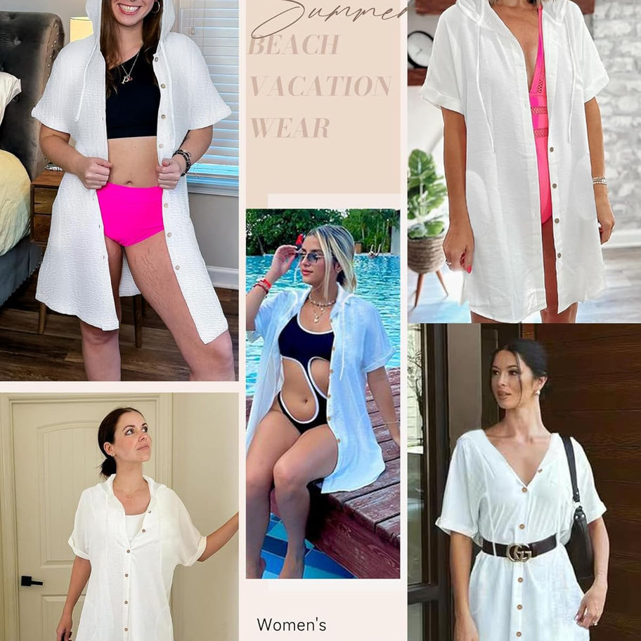 Cubierta de playa con capucha: la capucha con cordón cuenta con un diseño de botones, completo con mangas cortas, un dobladillo lateral y una longitud por encima de la rodilla para un aspecto elegante y casual. La capucha proporciona una buena protección para el cuello y el cabello mojado
