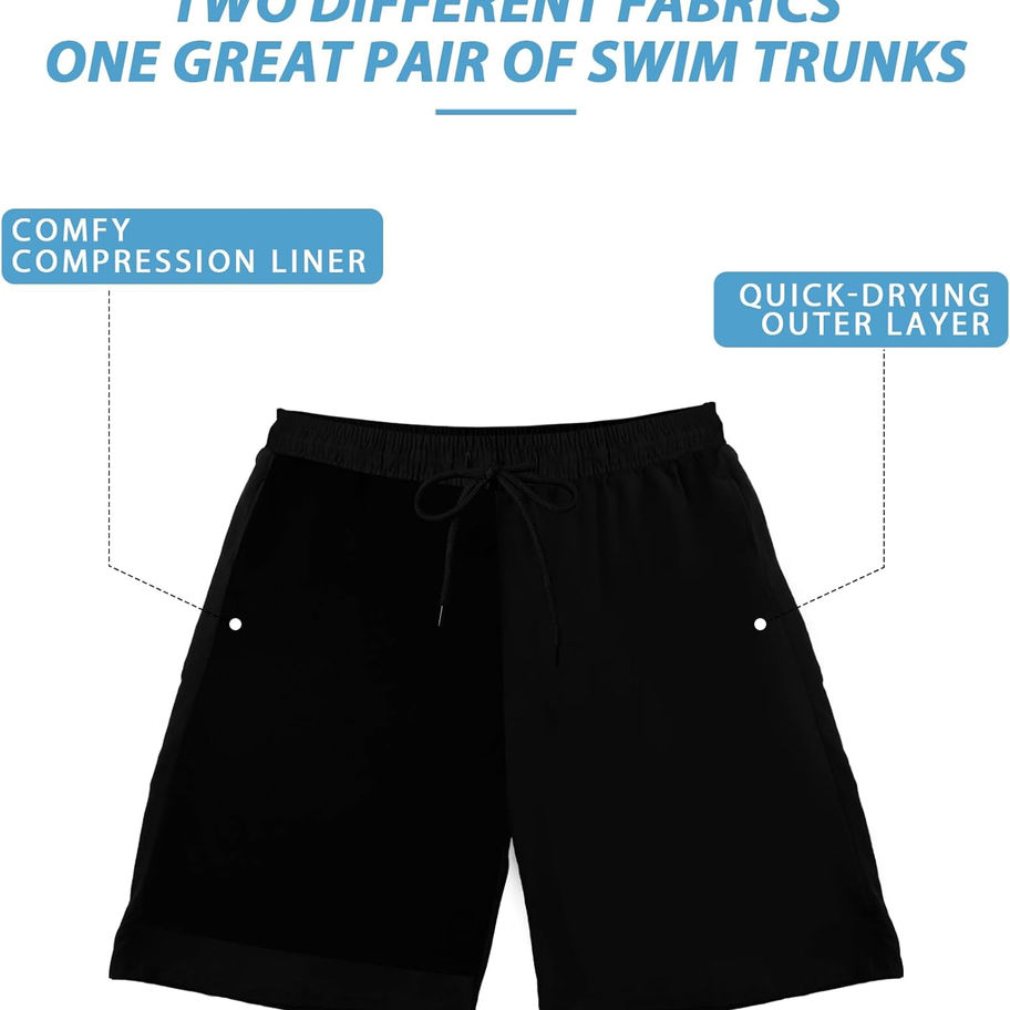 Telas cómodas y de calidad: nuestros pantalones cortos para hombre están hechos de materiales de alta calidad. La tela exterior de los pantalones cortos es ligera y duradera, lo que te permite moverte libremente. El tejido de forro de compresión es más elástico, ligero, transpirable y suave al tacto, lo que te proporciona una experiencia de uso más cómoda. Todas las telas tienen una excelente función de secado rápido, ya no necesitas usar pantalones húmedos durante mucho tiempo después de nadar, lo que te permite mantenerte seco y flexible.