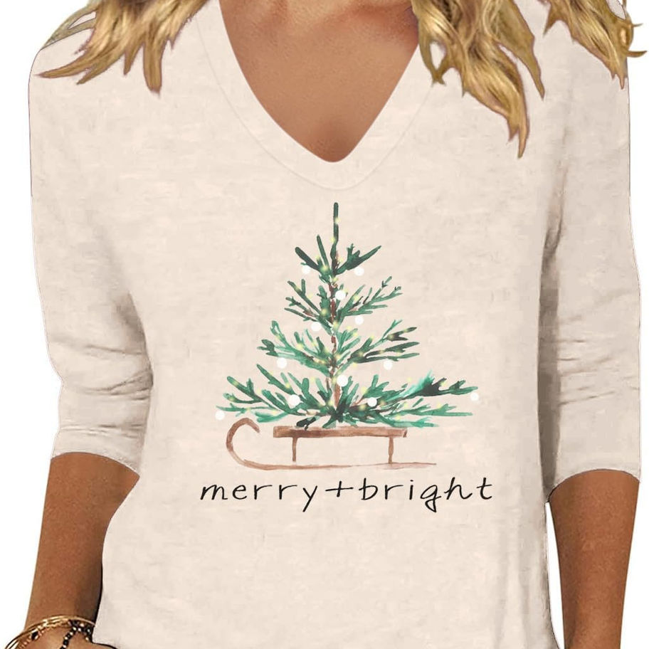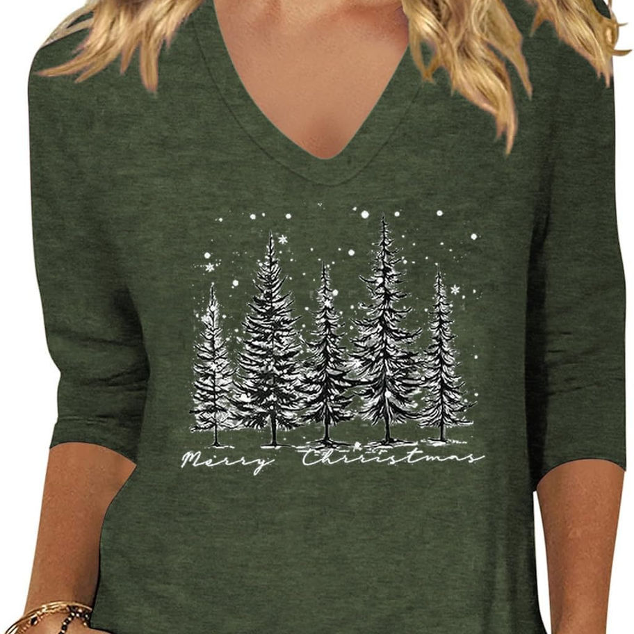 Camisa de Navidad con cuello en V para mujer, divertida camiseta de manga 3/4 c
