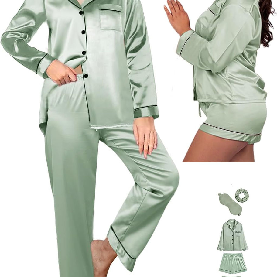 Características del producto: conjunto de pijama de satén para mujer, conjunto de pijama largo de seda para mujer, conjunto de pijama de pijama de ajuste holgado, cómodo, con el pantalón largo de cintura elástica y un pantalón corto, bolsillo superior en el pecho, botón acampanado. También con máscara de ojos de tela satinada y coleteros en color a juego con pijamas. Total de 5 piezas en el paquete.