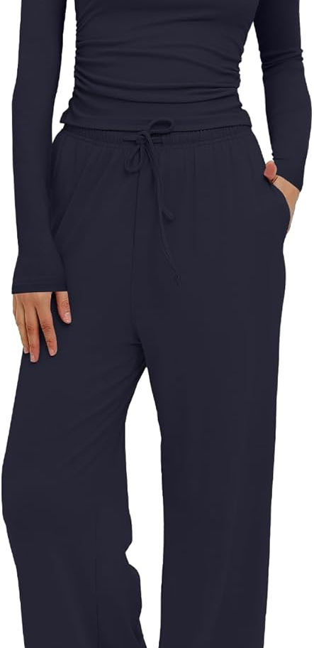 Detalles: parte superior de cuello redondo, mangas largas, detalles laterales fruncidos, silueta relajada y recortada. Pantalones: disponibles en dos longitudes de entrepierna: regular: de 28.35 a 29.13 pulgadas. Largo: de 30.31 a 31.10 pulgadas, cintura alta, cordón ajustable, bolsillos laterales, diseño fácil de poner, silueta de pierna ancha, tela elástica cómoda, perfecta para el uso diario.