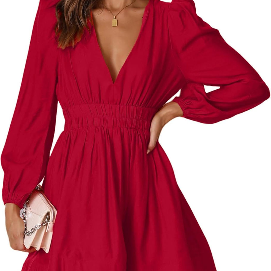 Características: mini vestido para mujer por encima de la rodilla, sexy, cuello en V profundo, manga larga de linterna con puño elástico suave, casual, acampanado, semiformal, fluido, fruncido elástico, forro en el busto y dobladillo delicado.