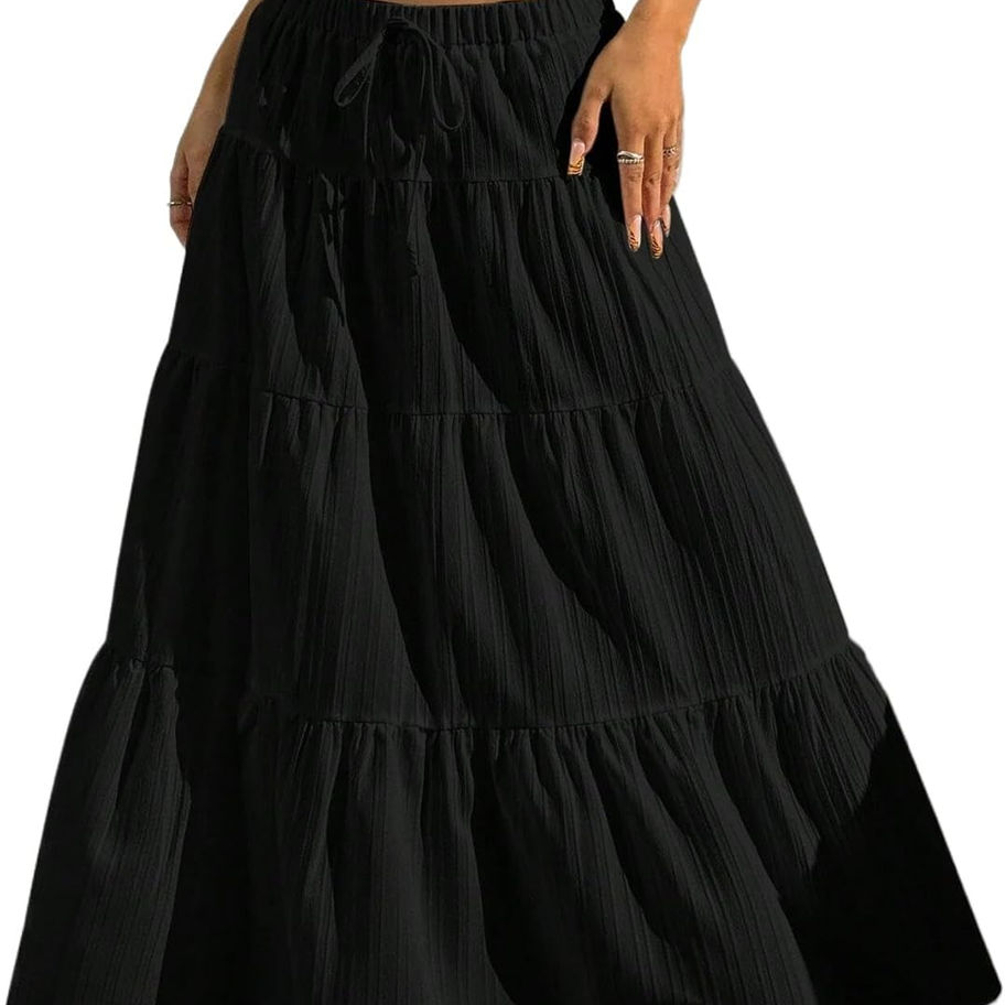Estilo: con cintura alta elástica, color sólido, fruncido, falda fluida escalonada con volantes, coqueta, elegante y cómoda, color liso, con capas, falda casual, falda larga acampanada bohemia con volantes para mujer, falda larga blanca para mujer, faldas largas de lino para mujer, trajes de coachella para mujer, falda bohemia, faldas bohemias de verano para mujer, cintura elástica bohemia plisada en línea A, falda larga blanca, falda larga con lazo blanco, trajes de Nashville para mujer, faldas largas para mujer