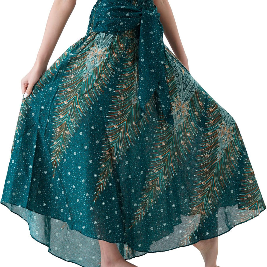 Las faldas largas para mujer vienen en una amplia variedad de tallas estándar de EE. UU.: 0-14 (XS-L), 16-20 Plus (L-2XL), y 20-24 Plus (2XL-3XL). La falda bohemia viene con un estilo de dobladillo asimétrico
