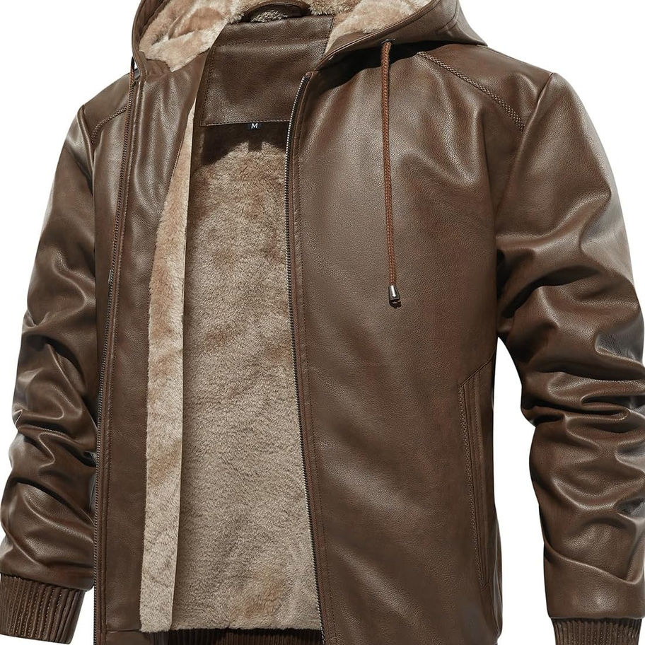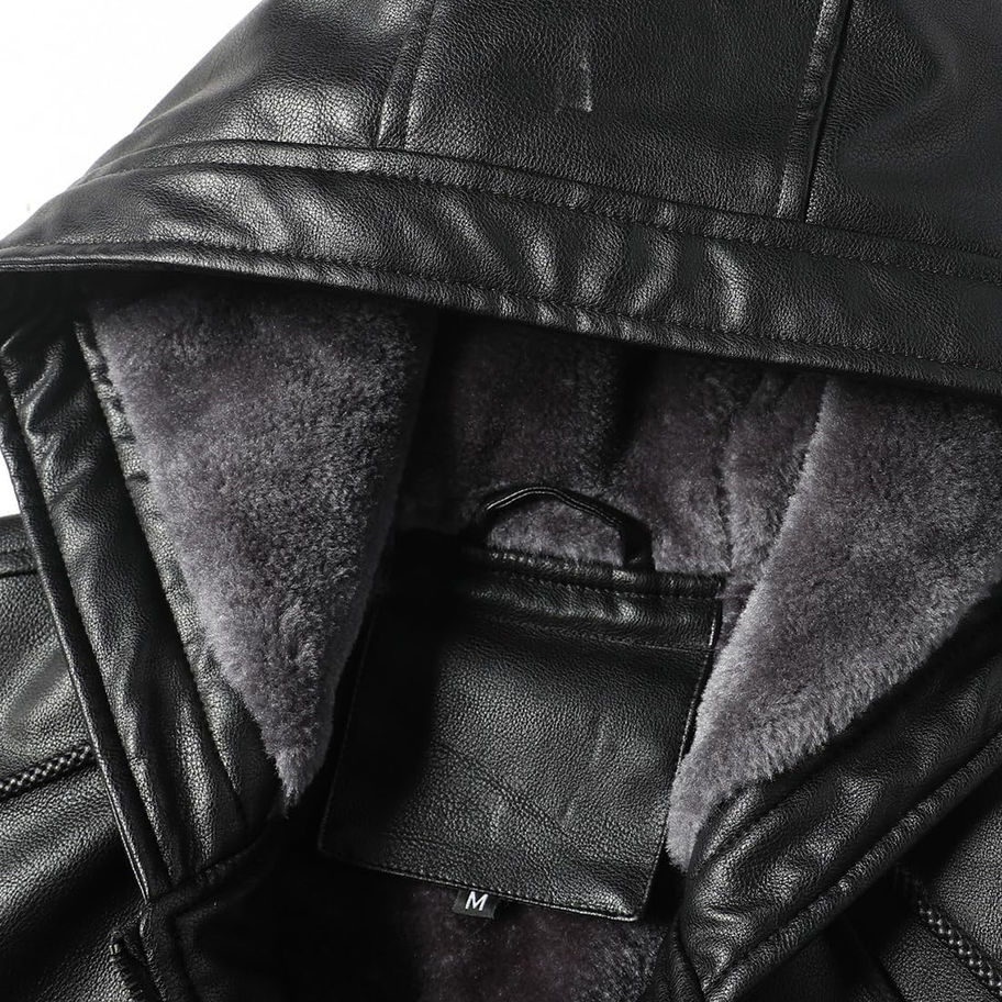 Detalles: chaqueta de cuero con forro polar para hombre con capucha/cierre frontal suave con cremallera. Dos bolsillos inclinados, prácticos y exquisitos. Es segura y conveniente para tu teléfono y tarjeta.