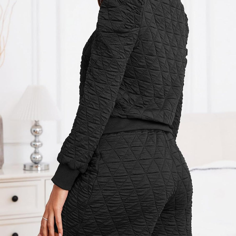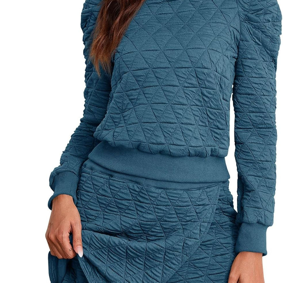 Diseño elegante: las mangas largas de la sudadera, adornadas con delicados volantes, proporcionan una capa adicional de comodidad y dan un toque de encanto juguetón. El patrón da una sensación de lujo, por lo que es una pieza que destaca, incluso en entornos relajados. La falda pantalón es una fusión inteligente de pantalones cortos y falda, tiene un llamativo estampado de rombos que le da un toque clásico pero moderno. La combinación de estos detalles crea un conjunto de descanso que se siente tan bien como se ve.