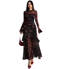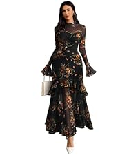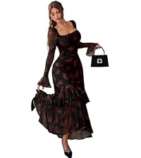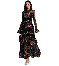 GothDark Womens Floral Maxi Dress Sheer Mesh Bell Sleeve Tiered Ruffle Gothic R