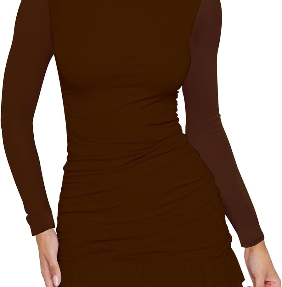 HOCILLE Women's Sexy Bodycon Boat Neck Mini Dresses Mesh Long Sleeve Ruched Ruf