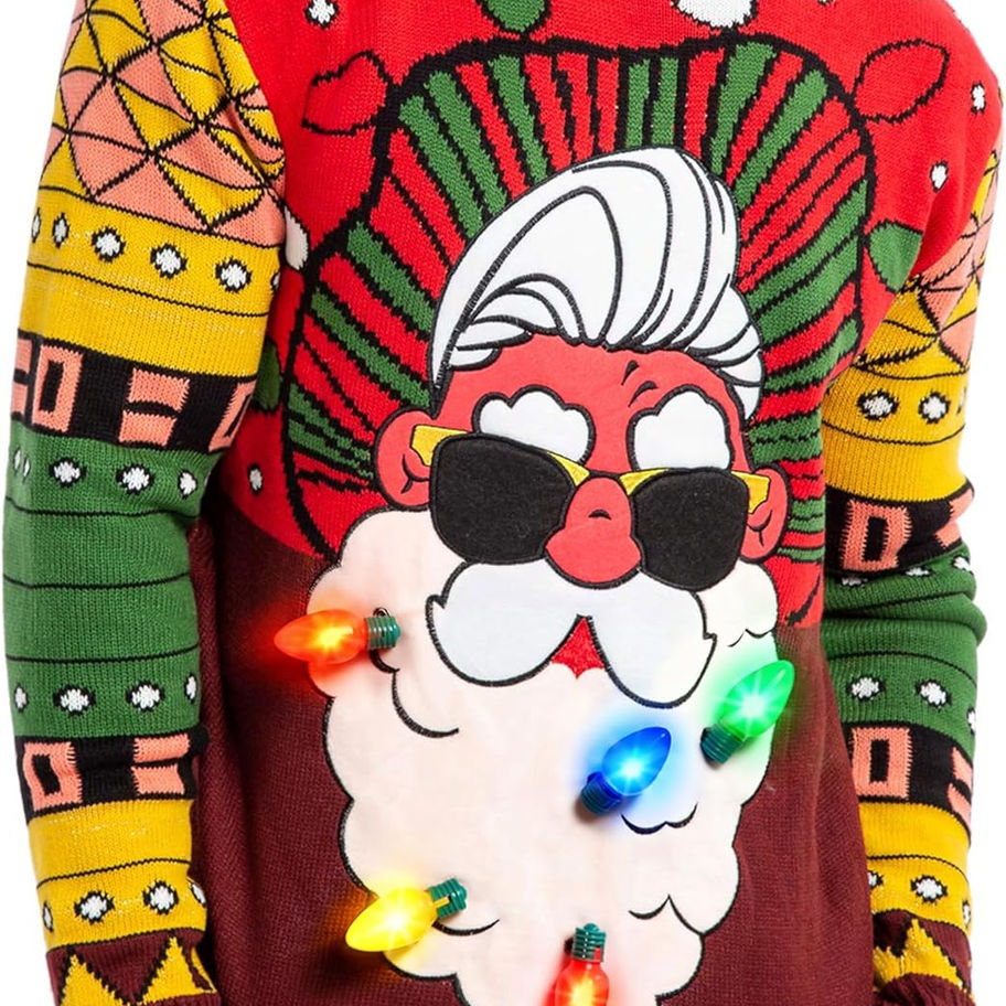 Único y festivo. Este suéter feo de Navidad seguro atraerá todas las miradas en tu próxima celebración navideña. Esta llamativa obra maestra textil incluye luces intermitentes que provocarán algunas risas de tus amigos y familiares. ¡Celebra tu espíritu navideño con estos fantásticos suéteres navideños!