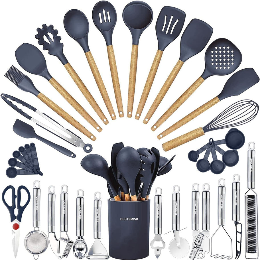 35 utensilios de cocina: el juego de utensilios incluye todo lo que necesitas para cocinar ese plato perfecto, incluye espátula ranurada, cuchara ranurada, espátula flexible, espátula ranurada, volteador sólido, servidor de pasta, cuchara sólida, pinzas de cocina, cuchara escurrente, batidor, cuchara profunda, espátulas, cepillo, pelador, cortador de pizza, abridor de botellas, papa, pusa. ella, helado Cuchara, abrelatas, rallador, tijeras, juego de tazas y cucharas medidoras, ganchos, colador de té, trituradora de ajo, cuchillo de queso, espátula, soporte