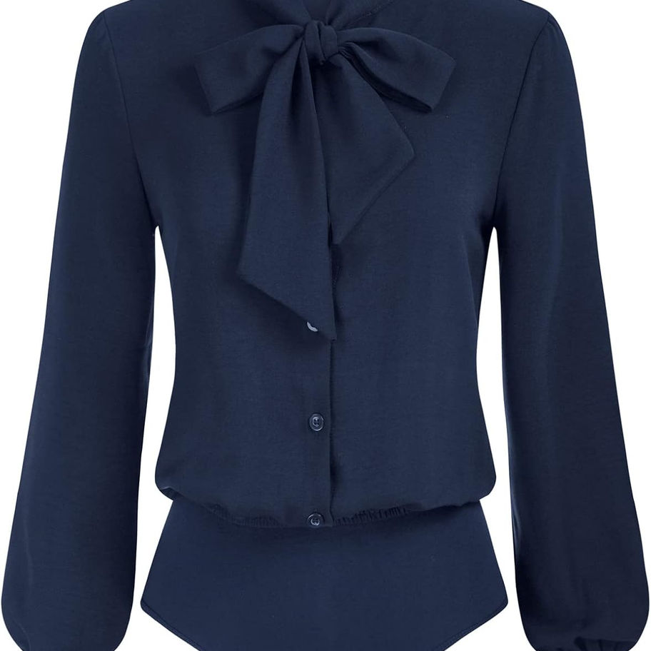 Diseño moderno y elegante: cuello en V con pajarita, escote modesto pero moderno. Silueta de ajuste regular, botón en la parte delantera, mangas largas con puños de botón