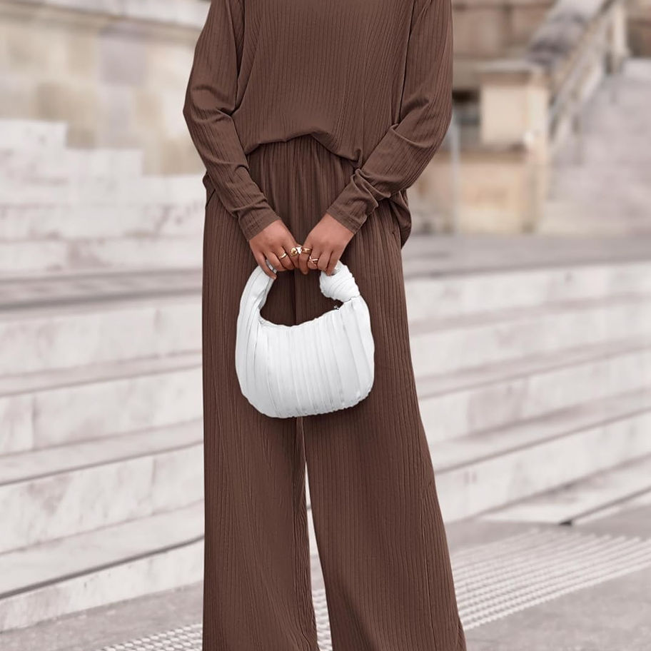 Conjuntos de ropa de descanso para mujer: conjunto de descanso de 2 piezas para mujer con una camiseta de punto acanalado de manga larga con cuello redondo y pantalones de pierna ancha a juego. Silueta relajada con un corte de pierna ancha no restrictivo que permite un fácil movimiento
