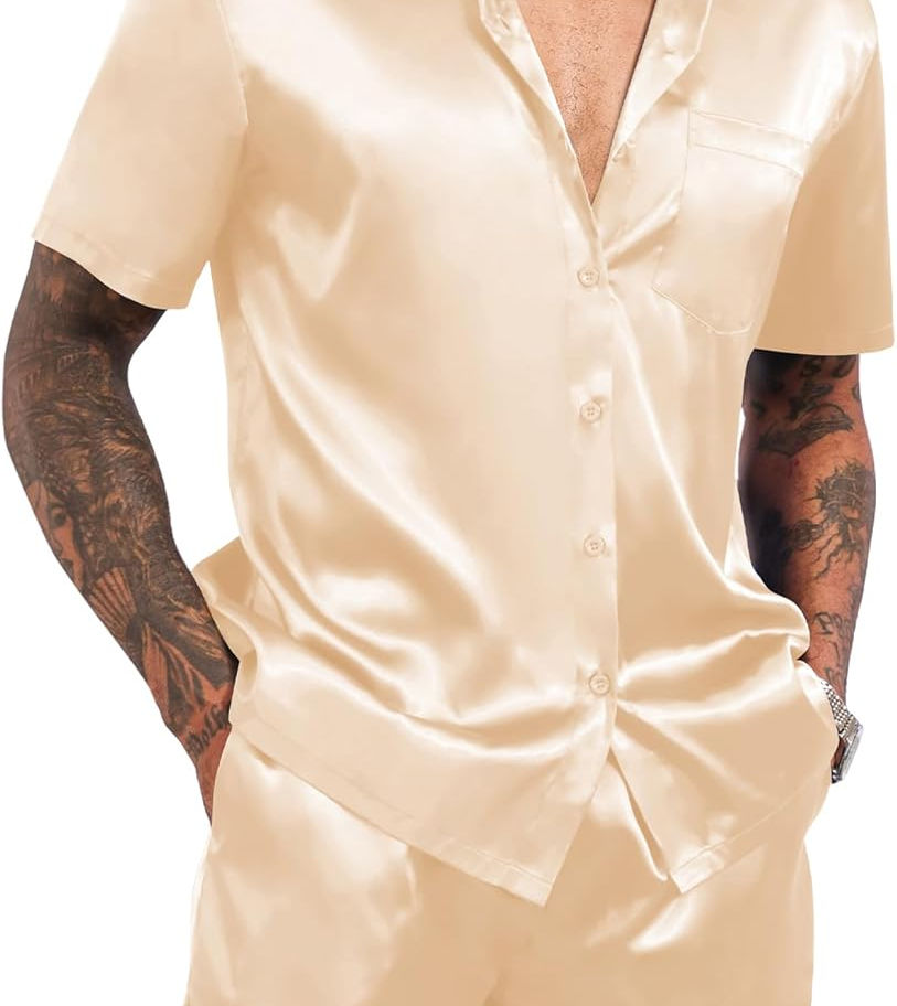 Paquete: 1 camisa de satén de seda con botones y 1 pantalón corto de satén para hombre. Cuidado de la prenda: lavar a máquina / lavar a mano (se recomienda lavar a mano, mejor con agua a menos de 104 °F), limpiar en seco, colgar o secar al aire, no usar blanqueador