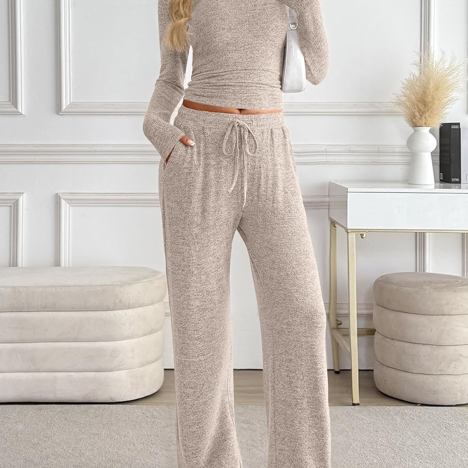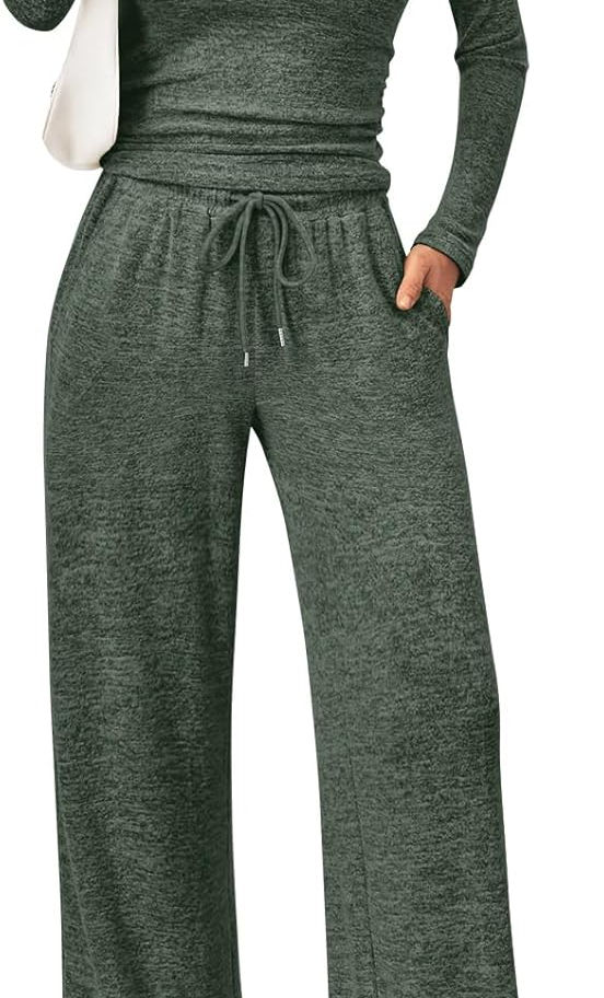 Diseño de conjunto a juego: este conjunto de dos piezas cuenta con una camiseta de manga larga con cuello redondo y elegantes pantalones de pierna ancha con una banda elástica con un cordón ajustable.