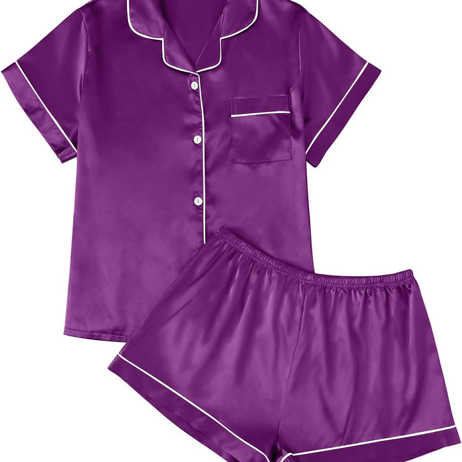 Características: este cómodo conjunto de pijama de dos piezas de ajuste relajado incluye pantalones cortos sedosos con pretina elástica combinados con una camisa de manga corta, suave y sedosa, con bolsillo en el pecho, cuello en V con muesca en las solapas y parte frontal con botones que llega hasta la cadera. Este conjunto de ropa para dormir es suave y elegante, para que duermas plácidamente.