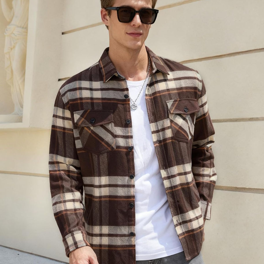 Diseño de moda: la camisa de franela cuenta con un patrón clásico a cuadros con un dobladillo curvo, solapa frontal con botones y puños, además de dos bolsillos funcionales con solapa en el pecho para un almacenamiento cómodo de los elementos esenciales cotidianos