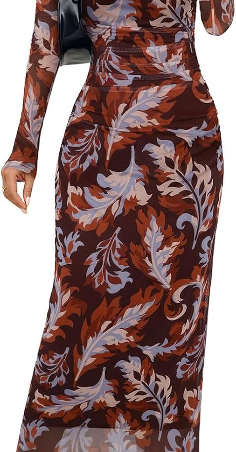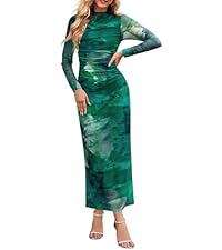 DESIGN: Long sleeve, mock neck, ruched detail, tie-dye print, mesh fabric, side zipper, maxi length, classy style, slim fit, bodycon dress for women, lightweight dresses for women.