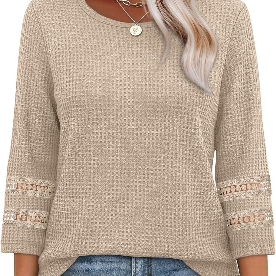 Elegante y amigable con los negocios: diseñada con mangas 3/4 de ganchillo de encaje chic, esta camiseta ofrece elegancia y comodidad. Se transforma sin esfuerzo de salidas casuales a ropa de oficina profesional, es un artículo esencial para todo el año