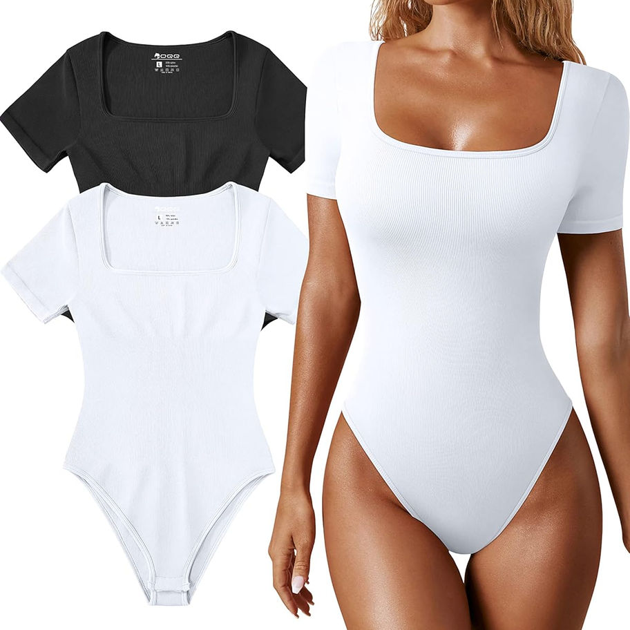 OQQ Body de 2 piezas para mujer, sexy, acanalado, de una pieza, cuello cuadrado