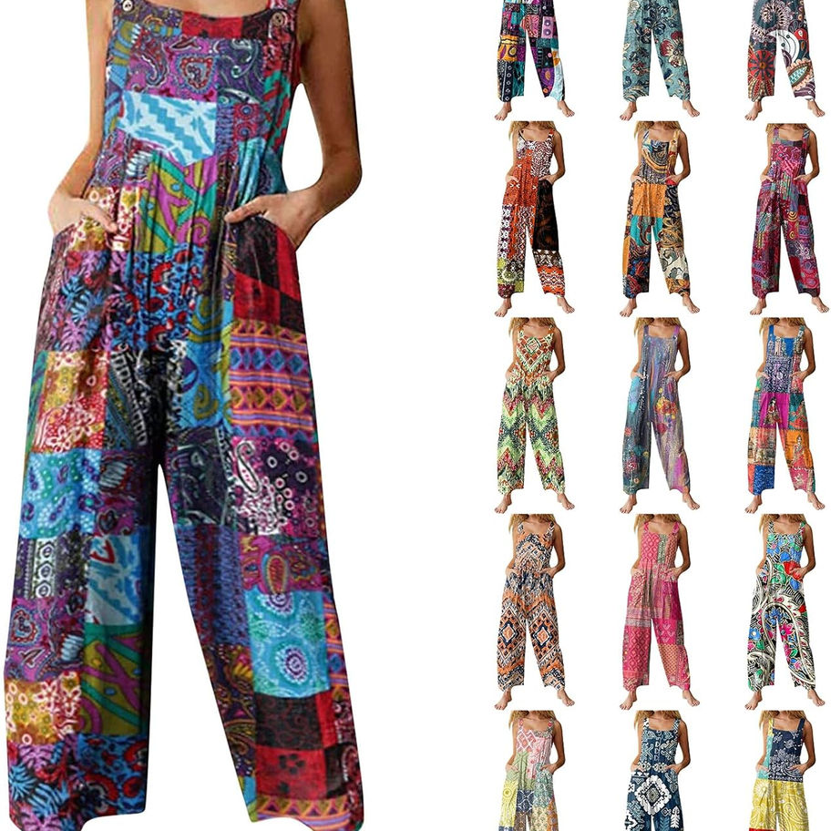 Overol de lino bohemio para mujer, diseño floral, holgado, con pechera de retaz