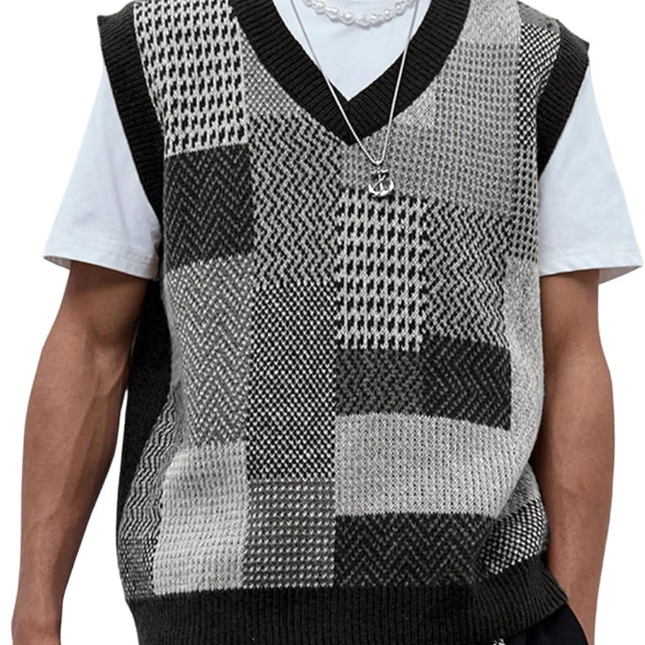 Diseño: bloque de color, estampado a cuadros, cuello en V, sin mangas, chaleco de suéter retro, jersey de punto para hombres