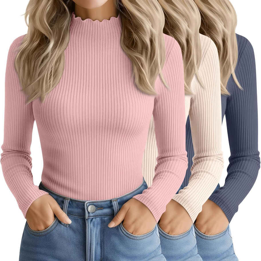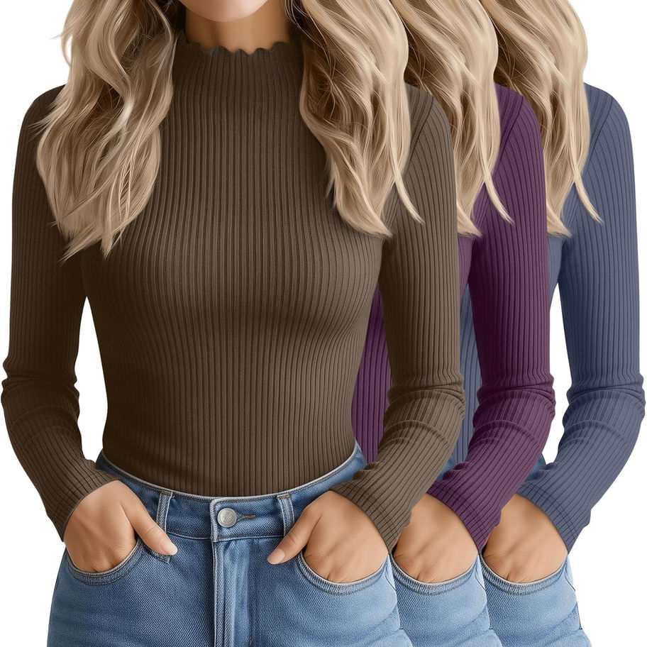 Paquete de 3 camisetas prácticas: el paquete de camisetas ajustadas para mujer viene en varios colores sólidos y satisface completamente tus necesidades diarias; los suéteres acanalados de cuello alto también son un regalo maravilloso para ti, amigas, madres, esposas o niños