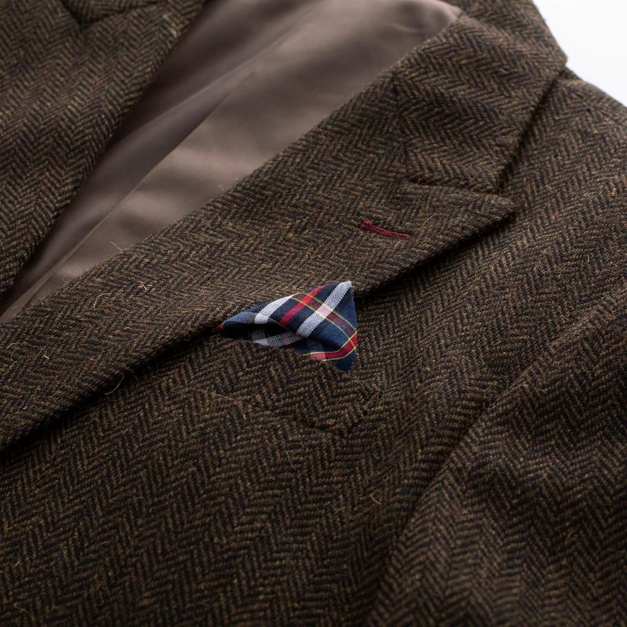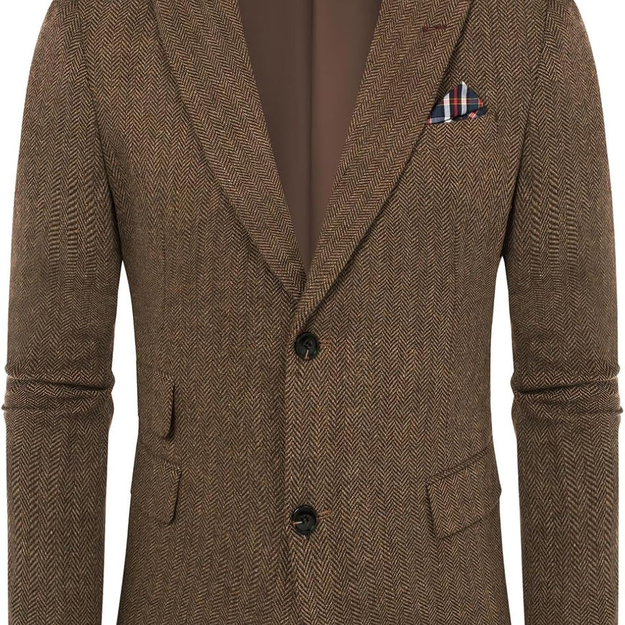Tweed de espiga: El blazer de tweed para hombre es de tela de espiga, esto presenta un patrón de espiga diagonal, que parece un zigzag. El patrón de pata de gallo es clásico y elegante