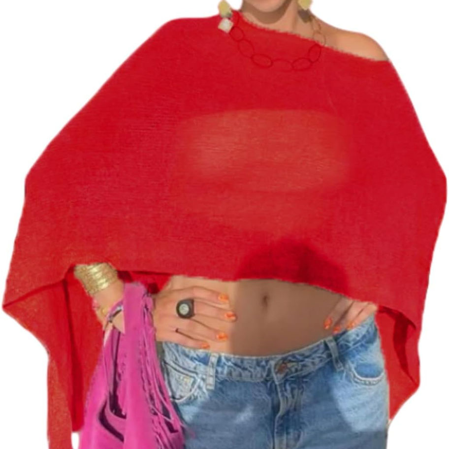 Diseño único: color vendido, ajuste holgado, cuello redondo. Poncho de punto transparente Y2K para mujer, poncho de punto transparente para mujer, poncho de punto con hombros descubiertos para mujer.