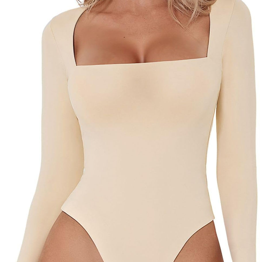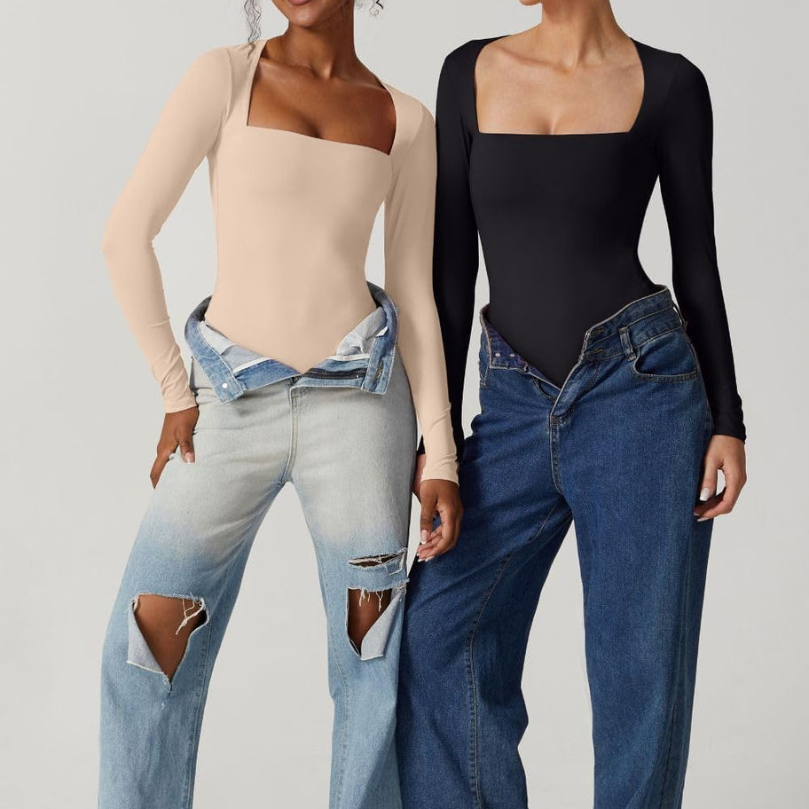 QINSEN Body sexy de manga larga con cuello cuadrado para mujer