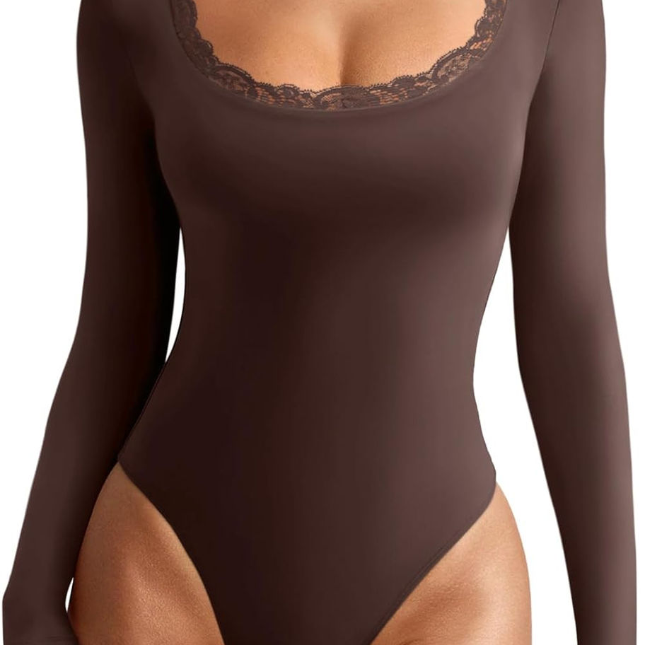 REORIA Body sexy de encaje con cuello redondo y manga larga con doble forro par