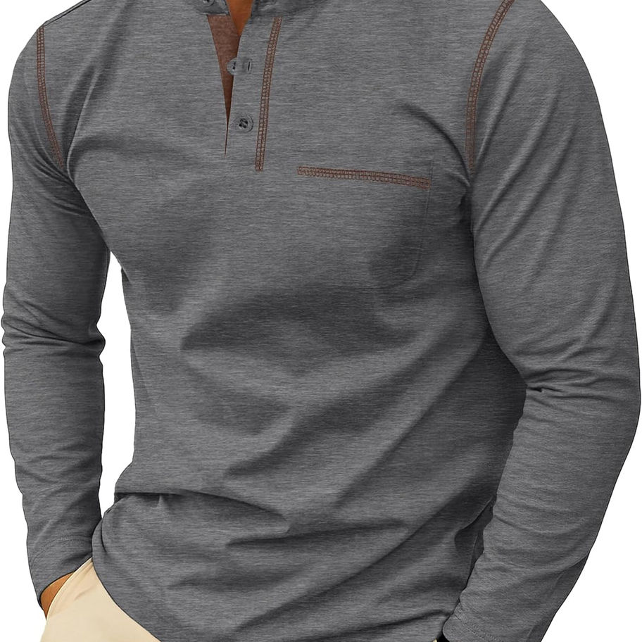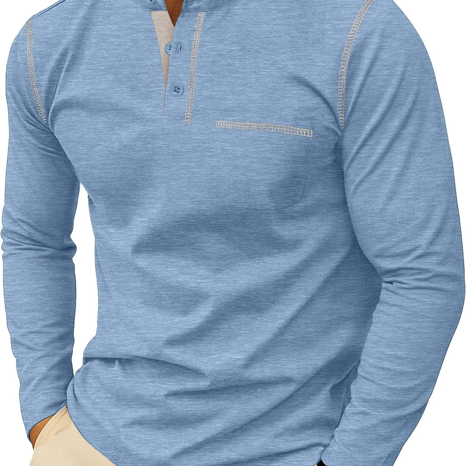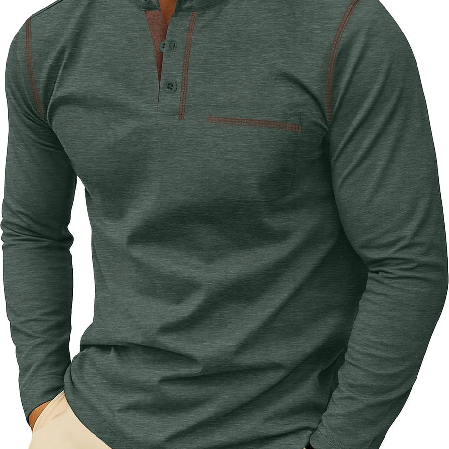 Camiseta clásica Henley: manga larga en contraste de color con solapa de 3 botones y bolsillo en el pecho. Fabricado con costuras resistentes para un aspecto limpio y casual. Un artículo esencial para tu guardarropa atemporal.