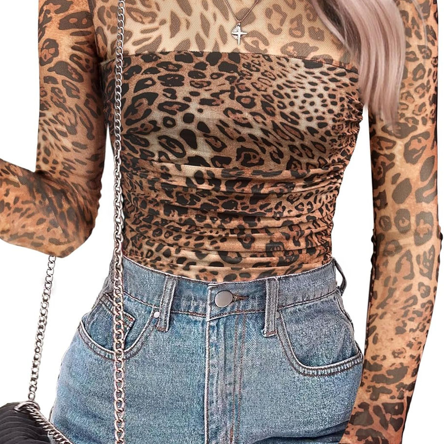 SAUNGKUAI Body de malla de manga larga para mujer, con cuello alto falso, tanga