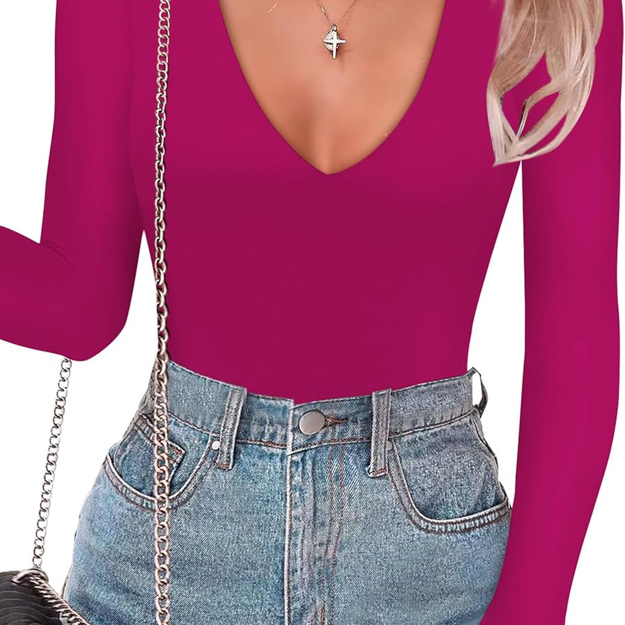 SAUNGKUAI Body de manga larga con cuello en V profundo para mujer, con doble fo