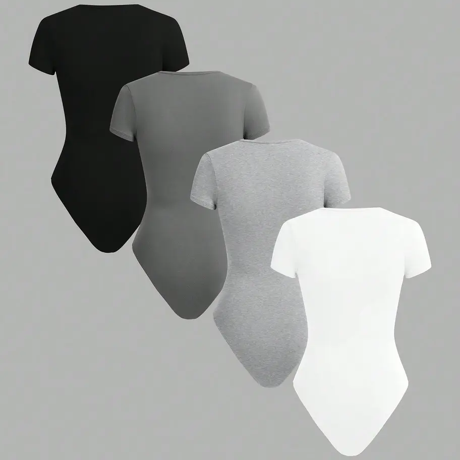 SHEIN BASICS Set de 4 bodys ajustados de mujer de unicolor con cuello de equipo y manga corta, de punto