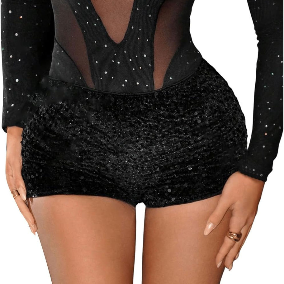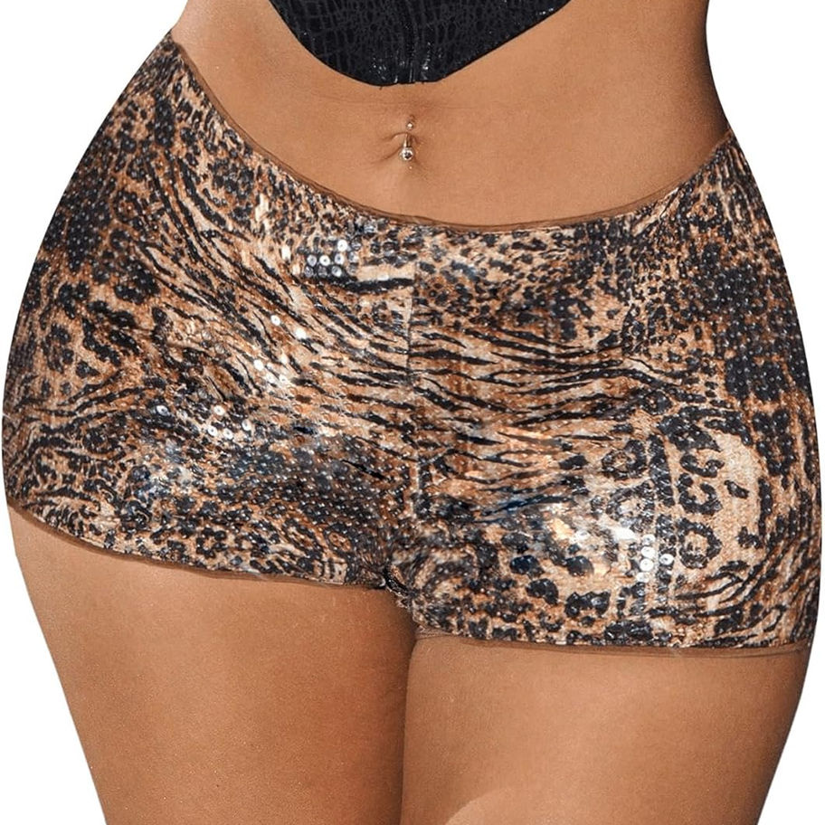 Características: mini pantalones cortos, estampado de leopardo, lentejuelas, cintura ultra baja, bodycon, micro mini pantalones cortos