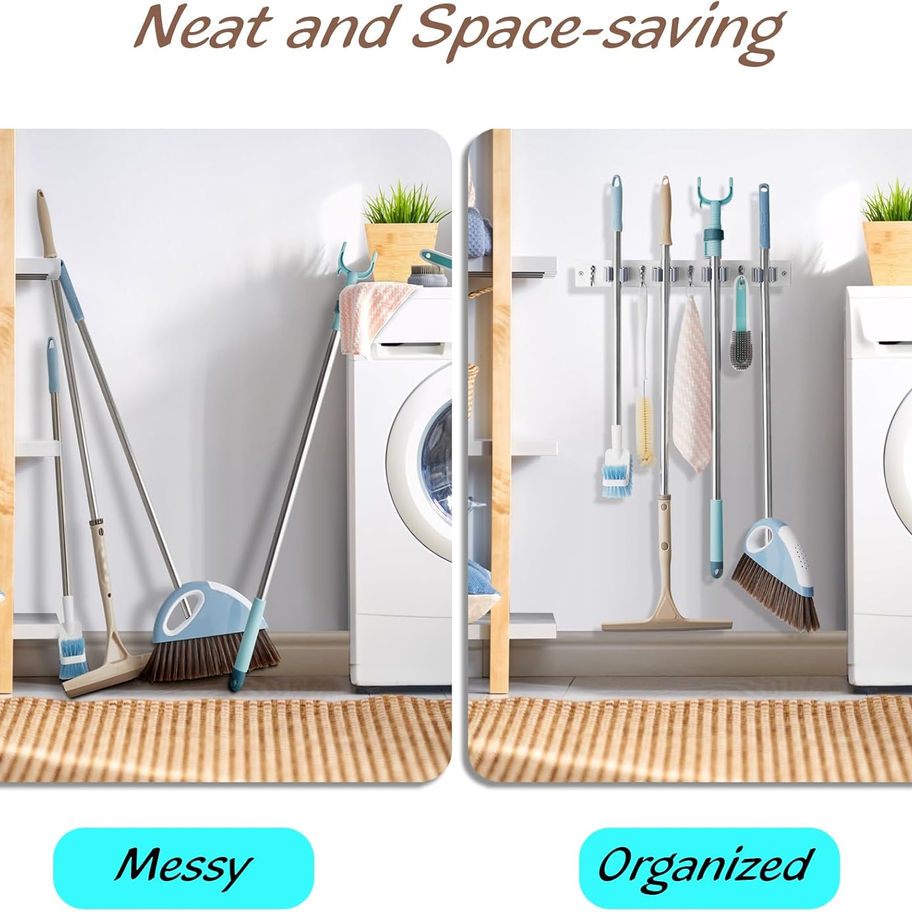 Organiza y ahorra espacio: el soporte para trapeador y escoba montado en la pared te proporciona un fácil acceso para almacenar y agarrar escobas, recogedoras y trapeadores, mientras que también libera espacio en el armario. Mantén tus herramientas de limpieza organizadas y al alcance.