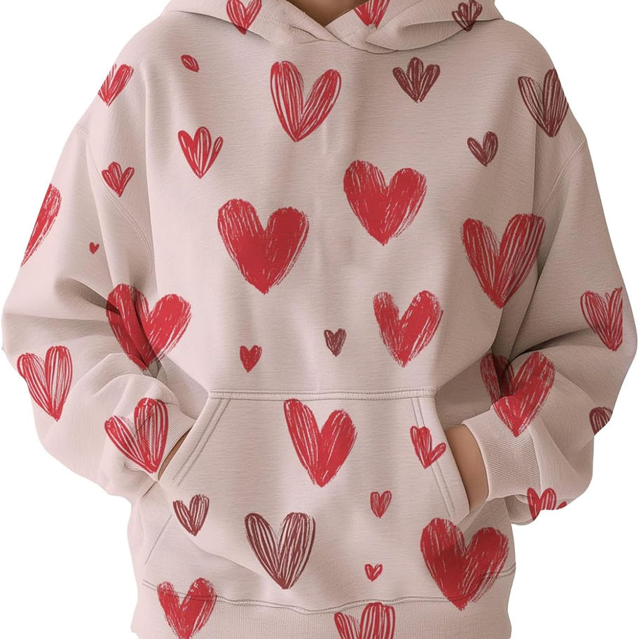 Características: diseñada para el día de San Valentín, bonito estampado de corazón, cuello de hombro caído, puños acanalados, forro polar, sudadera con capucha de corazón de amor para mujer, sudaderas de San Valentín para mujer, sudaderas con capucha de manga larga de gran tamaño con bolsillo, chaquetas con capucha, sudadera con capucha de ajuste holgado para mujer, estilo casual Y2K