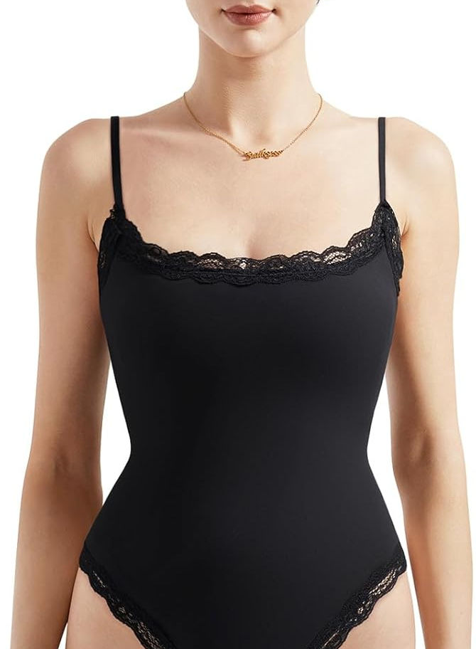 Body sin mangas con cuello cuadrado: camiseta sexy con ribete de encaje, body con tirantes delgados ajustables