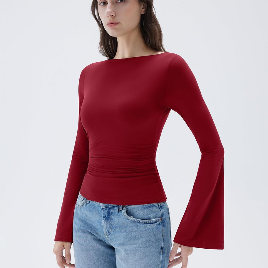 Slim Fit Camisas básicas de manga larga: cuello barco adelgazante top ajustado, mangas de campana encantadoras, camisas de mujer ajustadas de compresión, tops casuales de manga completa, camisas de longitud completa debajo de la ropa quirúrgica