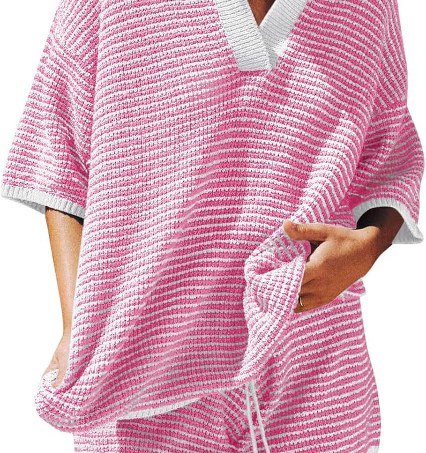 Características: Este conjunto de suéter extragrande para mujer cuenta con diseño de manga 3/4, cuello en V, cuello/cuello de solapa, pantalones cortos de cintura alta elástica con cordón, ajuste holgado y color puro.