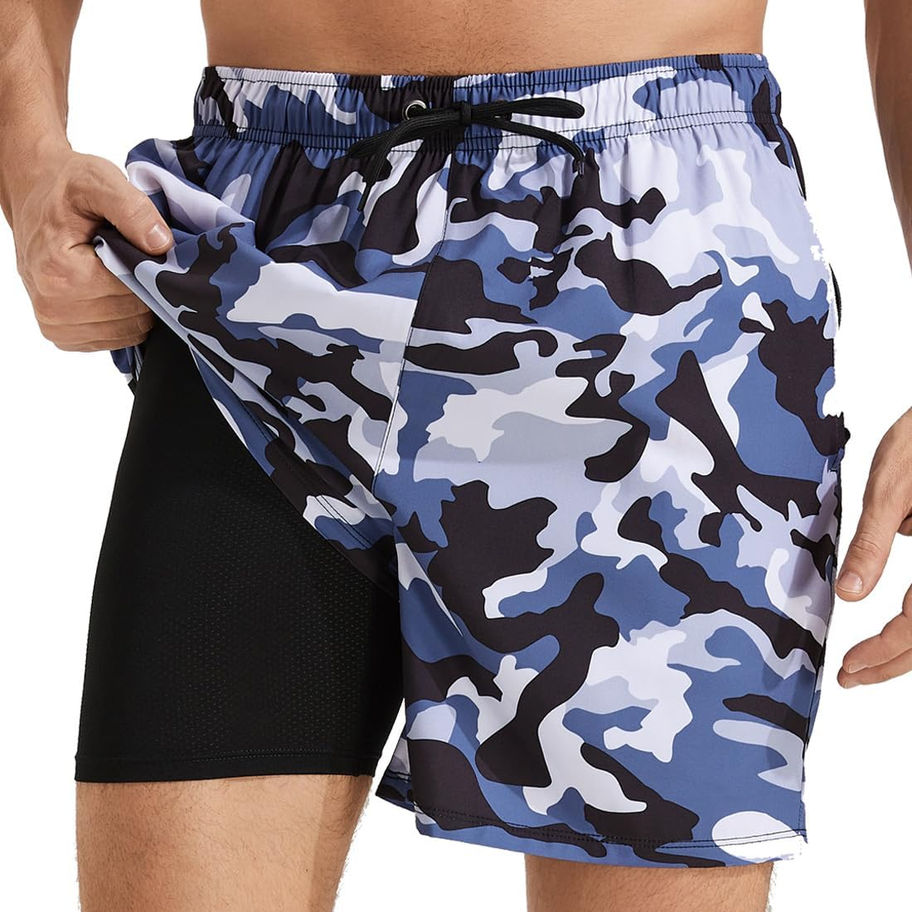 Traje de baño 2 en 1 para hombre con forro de compresión: forro de compresión integrado que protege tu piel de arañazos y evita que se pegue a tu piel cuando los pantalones cortos están empapados, muy buena elasticidad y transpirabilidad puede mantener tus deportes cómodos.