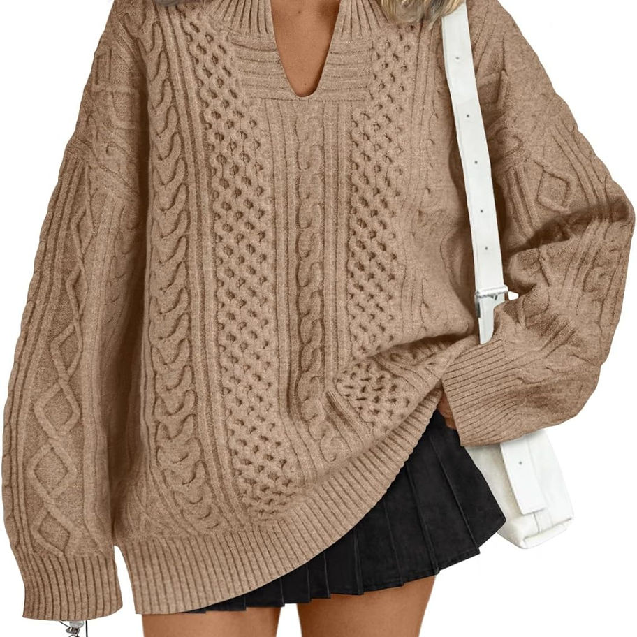 Trendy Queen Suéteres de punto trenzado de gran tamaño con cuello en V para muj